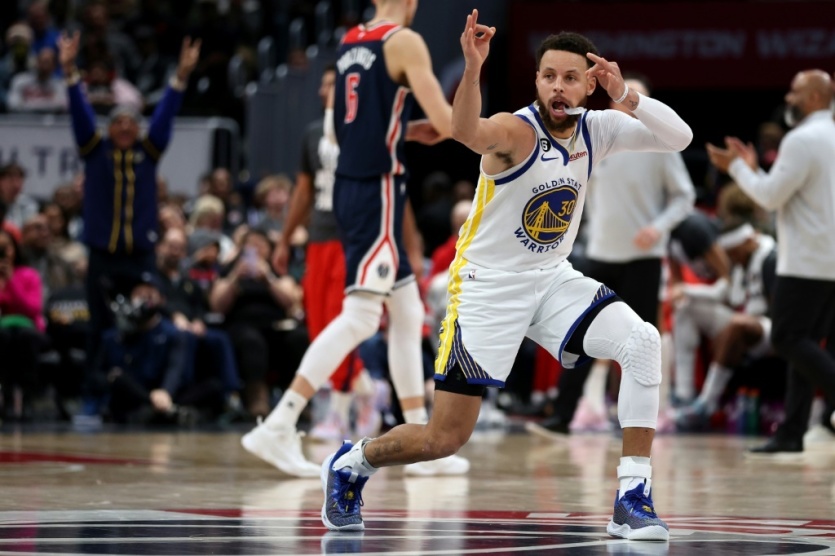 La star des Golden State Warriors Stephen Curry exulte lors du match de NBA sur le parquet des Washington Wizards, le 16 janvier 2023 Patrick Smith [GETTY IMAGES NORTH AMERICA/AFP]MERCI DE VOUS IDENTIFIER