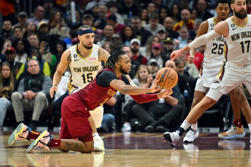Darius Garland, des Cleveland Cavaliers, à la passe lors du match de NBA contre les New Orleans Pelicans, le 16 janvier 2023 à Cleveland Jason Miller [GETTY IMAGES NORTH AMERICA/AFP]