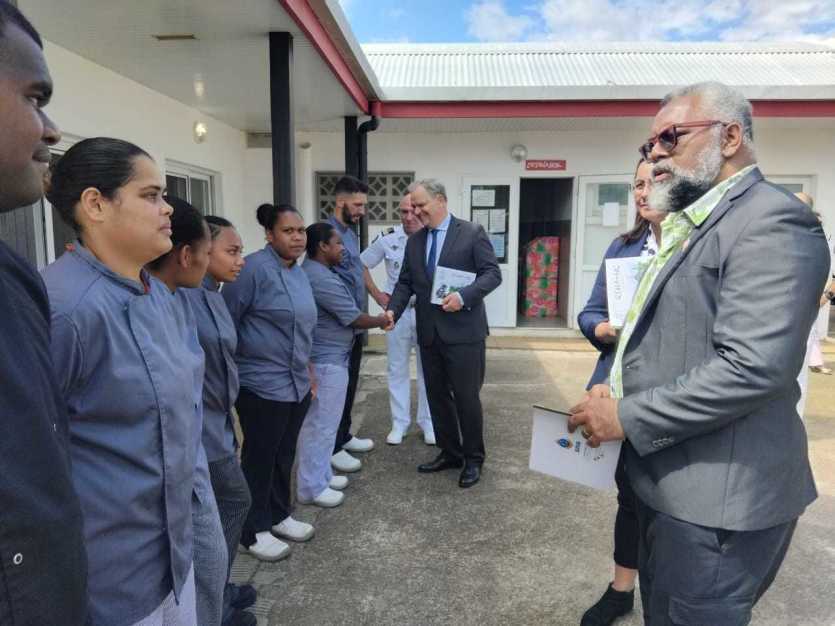 Le député Emmanuel Tjiabou et la présidente du Congrès Veylma Falaeo ont félicité, avec le ministre, le travail des volontaires en cuisine qui ont concocté le déjeuner pour les officiels. Photo Anthony Tejero"C'est une fierté et un plaisir de voir le travail de ces jeunes qui ont décidé de s'engager. On prend des gens qui ont pu avoir des difficultés, on les forme, on leur donne des capacités de pouvoir se préparer pour demain, en trouvant un travail ou en maintenant leur engagement (dans l'armée). C'est exemplaire", estime François-Noël Buffet, jugeant que le RSMA, sur le Caillou comme dans les autres territoires ultramarins, "remplit une mission essentielle". Et c'est pourquoi, "je peux dire aujourd'hui que le budget des RSMA sera maintenu et ne subira aucune baisse."