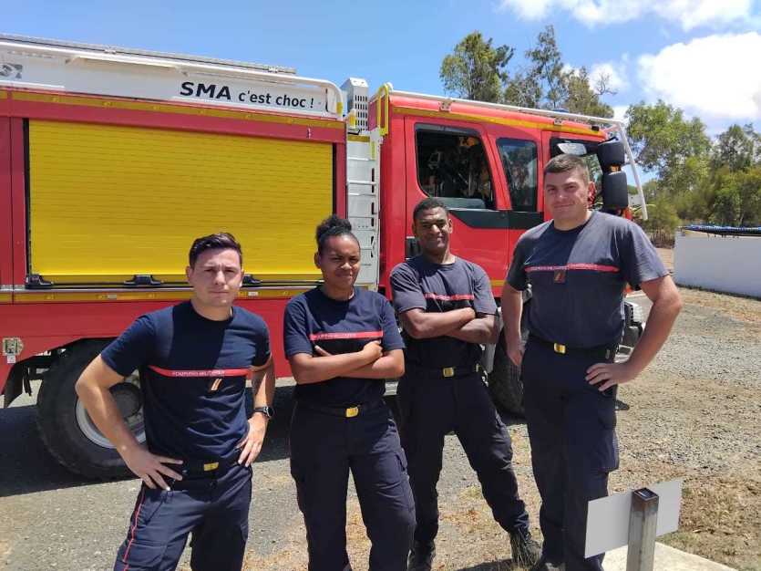 Le sergent Alexandre et le caporal-chef Adrien, ici avec deux volontaires en formations, se sont rendus à l’antenne de Koné, à l’occasion de la visite ministérielle. Photo Anthony TejeroL’antenne de Koumac propose la filière "métiers de la santé et des secours" qui permet notamment de former de jeunes sapeurs pompiers volontaires de Nouvelle-Calédonie, mais également de Wallis-et-Futuna. À ce titre, les moyens matériels et les quatre cadres qui gèrent cette formation peuvent être appelés en renfort de la Sécurité civile lors d’incendies lorsque les équipes sont "dépassées". Une situation qui s’est notamment produite vendredi 11 octobre, alors que les flammes menaçaient un lotissement et une tribu de Koumac.