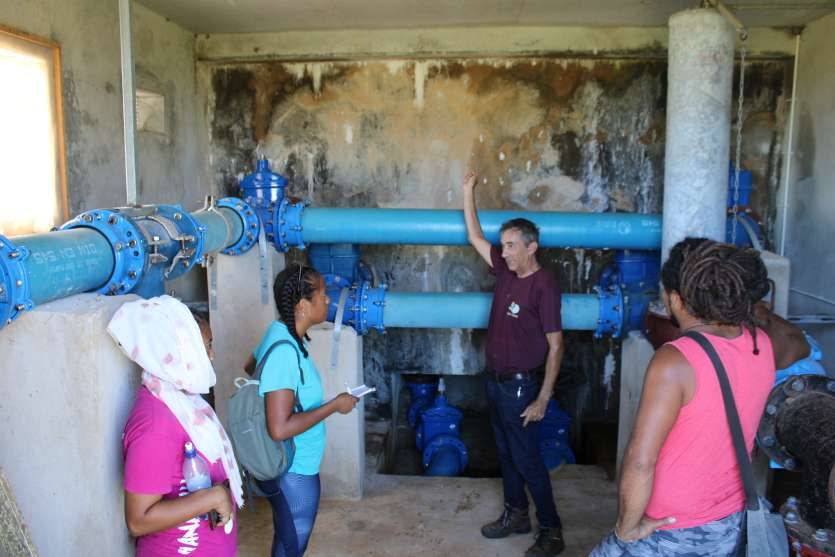 La journée s'est terminée par la visite d'un forage, situé non loin de La Pouembout. Photo Nikita HoffmannLa journée s'est poursuivie l'après-midi avec une réunion à la mairie de Pouembout, où les responsables et les acteurs du CIE, du SIVOM et d'Aqua Nord ont pu répondre aux questions du public. Avant une dernière visite au réservoir situé sur la propriété de Georgy Peraldi, à Creek-Salée. Ce réservoir, constitué d'une partie de stockage et d'une chambre de vannes, alimente en eau la population du sud de la commune. La journée s'est conclue par un détour au forage municipal, non loin de la Pouembout.