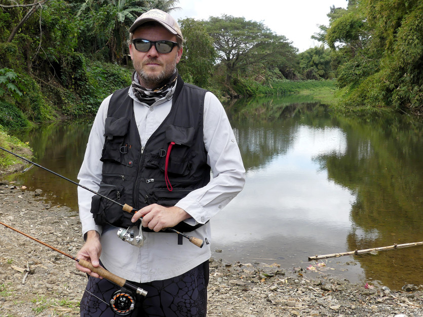 Un amas de branches flottantes, repère idéal pour les poissons d’eau douce, attire l’attention de Micky, immergé jusqu’aux genoux dans la rivière Pouembout. C’est ici qu’il va tenter de déposer sa mouche. Dans un mouvement de balancier, il étire le fil de soie au-dessus de sa tête jusqu’à ce qu’il obtienne la longueur souhaitée avant de poser la mouche à la surface de l’eau.