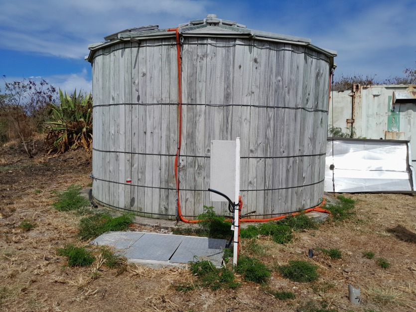 Une cuve de 45 m3 récupère l’eau de mer dessalinisée. Photo EnercalLe système de pompes est quant à lui alimenté par vingt panneaux photovoltaïques posés sur le toit de la maison commune de la tribu d’une puissance totale de 8,2 kWc, en plus d’une batterie de 20 kWh. Ainsi, la capacité de production est de "5 m3/jour en autonomie la journée, et jusqu’à 6 m3 en associant un groupe électrogène", indique Enercal.
