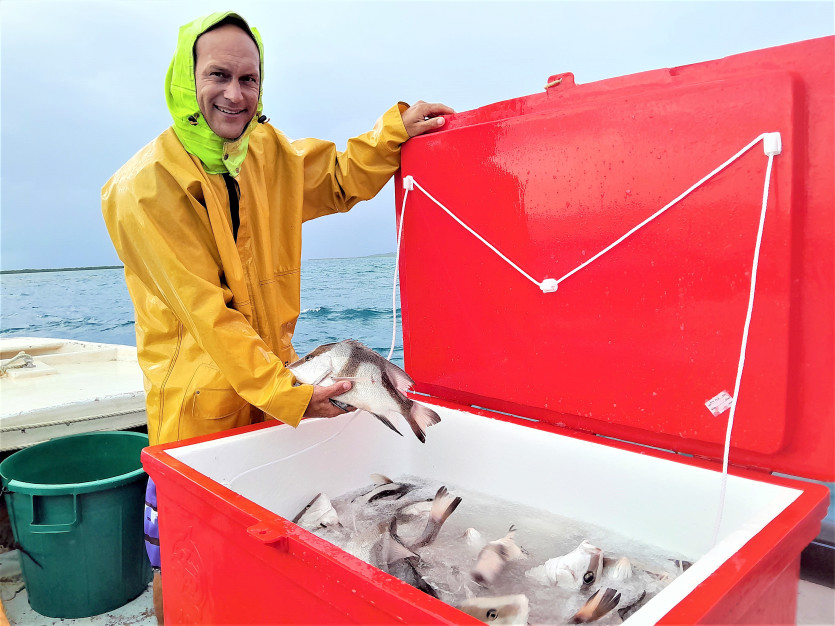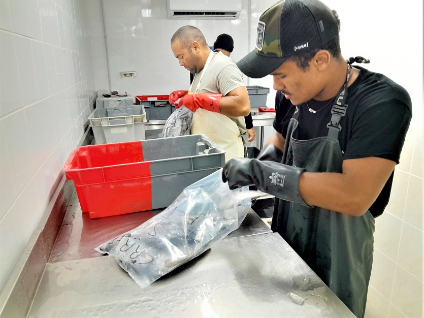 Avant d’assurer la livraison jusqu’à Nouméa, les équipes conditionnent elles-mêmes les poissons. Photo Anthony Tejero"Nous réalisons vraiment beaucoup de ventes durant cette période. La grosse plus-value avec les bassins d’élevage, c’est qu’on peut toujours pêcher, peu importent les conditions météo. Cela assure à nos clients une régularité des approvisionnements, poursuit Julien Esposito, qui livre chaque semaine plusieurs centaines de kilos de poissons dans le Grand Nouméa et dans la zone VKP (Voh-Koné-Pouembout). Les restaurateurs ou les gens du marché par exemple peuvent appeler le mardi pour commander des quantités précises et dès le mercredi, ils sont livrés avec des poissons en nombre suffisant et de la taille souhaitée. C’est très précieux, en particulier pour les ateliers de transformation et la grande restauration car tous ces acteurs souffrent des difficultés quant à l’approvisionnement et la régularité de la pêche traditionnelle."