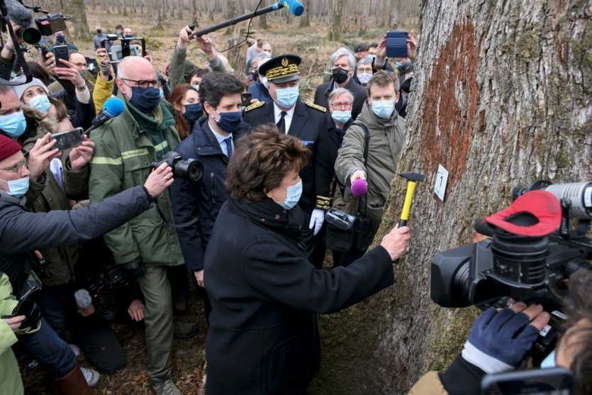 La ministre de la Culture Roselyne Bachelot (c) cloue le chiffre 1 sur le tronc d'un chêne sélectionné pourpour la reconstruction de la flèche de Notre-Dame, le 5 mars 2021 dans la forêt de Bercé, à Jupilles, dans la Sarthe THOMAS COEX [AFP]