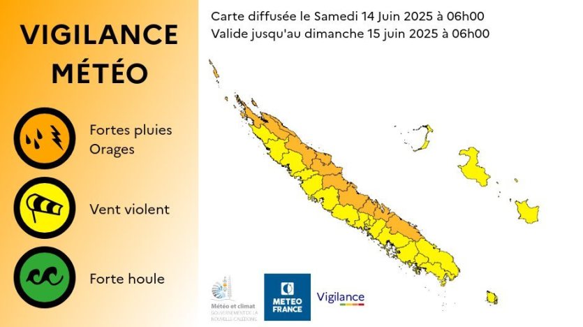 - A.-C.P. | Crée le 14.06.2025 à 09h14 | Mis à jour le 14.06.2025 à 09h14ImprimerLa carte diffusée par Météo-France ce matin est valable jusqu’à dimanche 15 juin 6 heures. Carte Météo-FranceLa pluie devrait prédominer aujourd’hui sur l’ensemble du territoire. Si onze communes étaient concernées par la vigilance orange fortes pluies et orages vendredi soir, elles sont désormais douze ce matin, celles de la côte Est, de Thio à Bélep, annonce Météo-France dans son bulletin. Le reste de la Grande Terre ainsi que les Îles Loyauté et l’île des Pins sont en vigilance jaune.