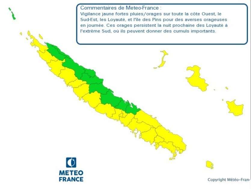 Météo France NC place en vigilance jaune "fortes pluies et orages" une grande partie du pays : l’ensemble de la façade Ouest, les Loyauté, l’île des Pins ainsi que Thio et Yaté. Des averses orageuses devraient ainsi se déclencher ce mardi, au cours de la journée. Ces orages devraient persister la nuit prochaine des Loyauté à l’extrême Sud de la Grande Terre, où ils pourraient donner des cumuls importants.