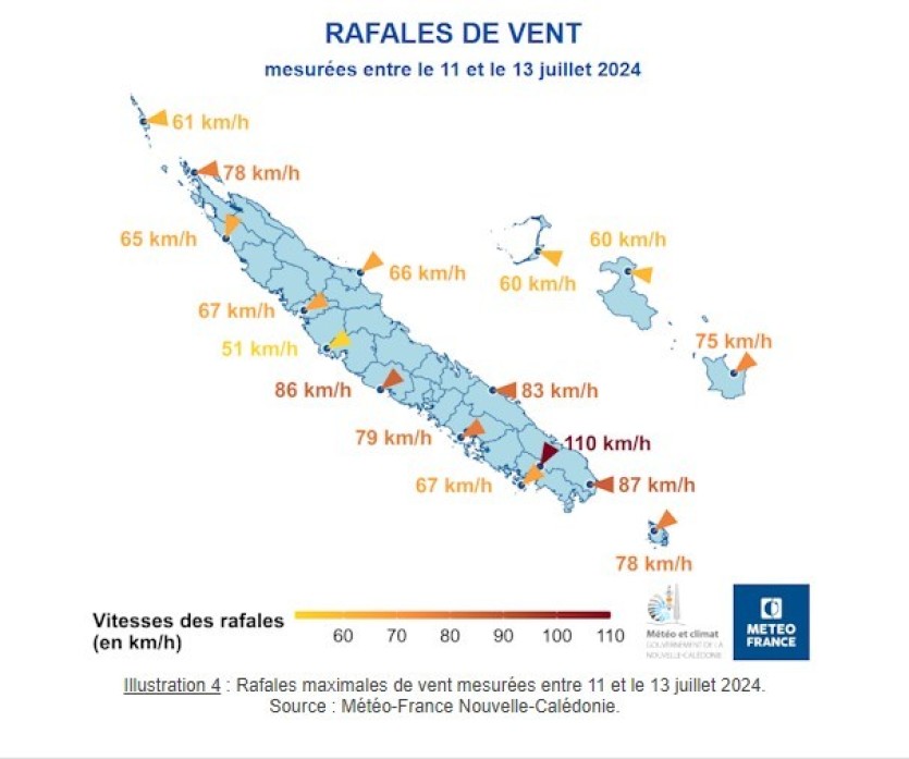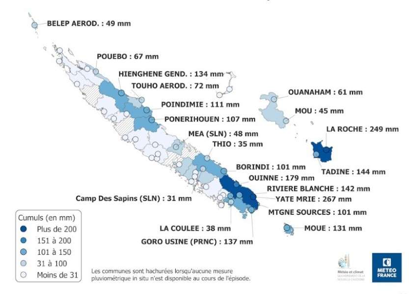 Dans le détail, Yaté et Maré se démarquent avec des cumuls totaux atteignant respectivement 249 mm et 267 mm. À la station de La Roche, c’est l’équivalent de presque 2 mois et demi de précipitations. Sur les communes de Poindimié, Ponérihouen, Hienghène, Yaté et l’île des Pins, il est tombé l’équivalent d’un mois à un mois et demi de pluie d’un mois de juillet habituel.