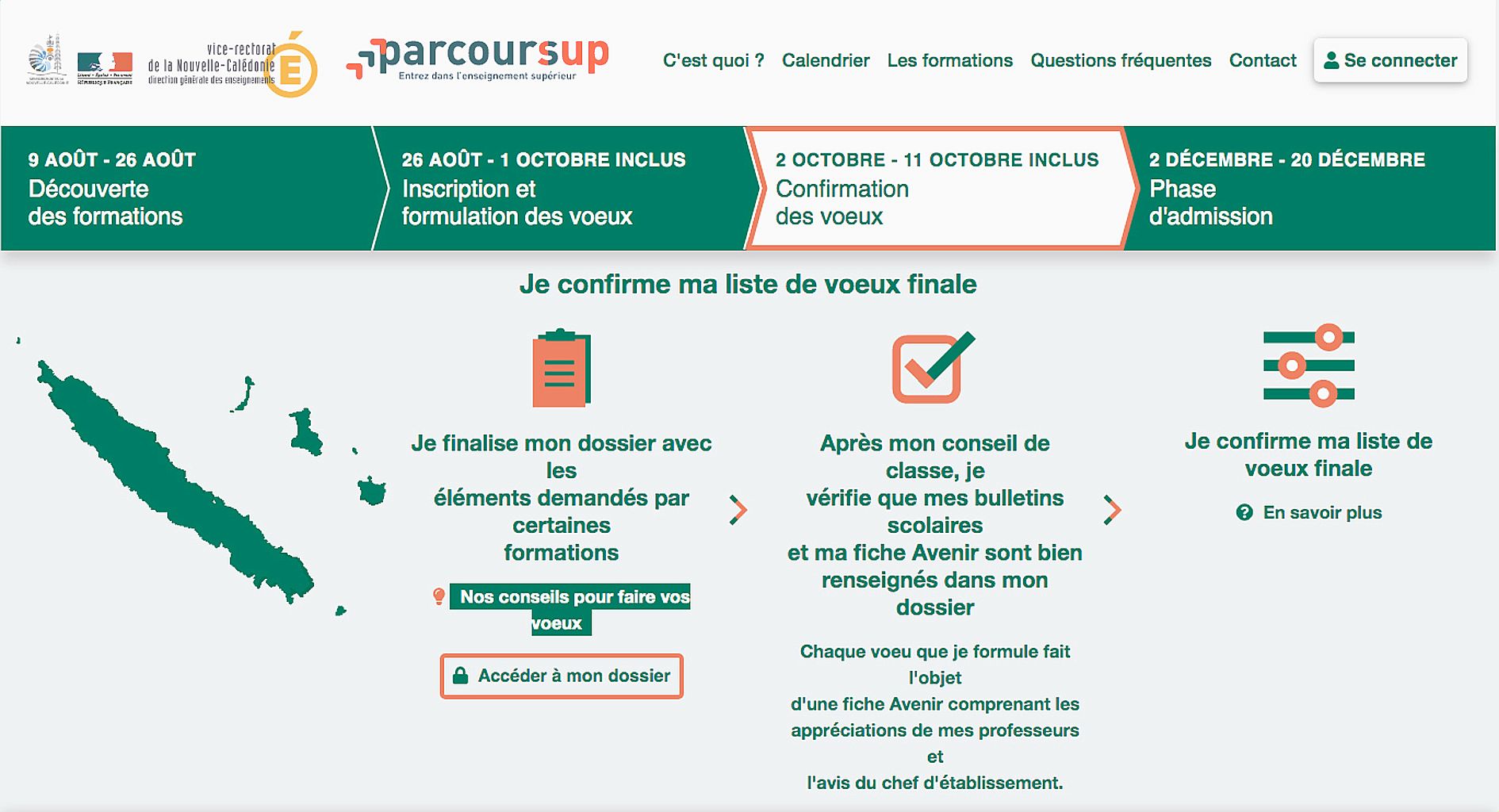 - ENSEIGNEMENT. La campagne Parcoursup destinée aux étudiants calédoniens a pris fin hier, après une ultime prolongation. Et d’après les premiers résultats, le système d’orientation fournit des résultats encourageants. Au 1er octobre, le vice-rectorat indique que quelque 4 000 éIl vous reste 84% de l'article à découvrir.Cet article est réservé aux abonnés.