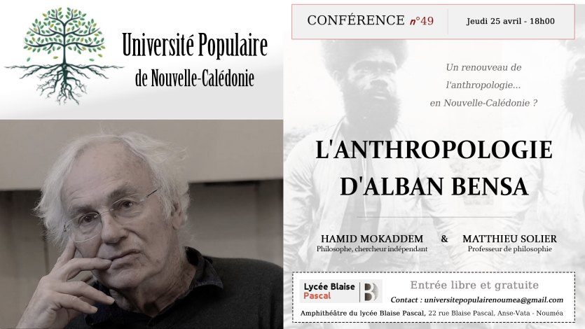 Première conférence de l’Université populaire de Nouvelle-Calédonie au lycée Blaise-Pascal. Photo UPNCL’Université populaire de Nouvelle-Calédonie organise sa première conférence de l’année. La thématique retenue est "L’anthropologie d’Alban Bensa". Elle sera animée par Hamid Mokaddem, philosophe et chercheur indépendant, et Matthieu Solier, professeur de philosophie. La conférence débutera ce jeudi à 18 heures et sera précédée de l’assemblée extraordinaire de l’association, à 17h30, pour permettre l’adhésion des membres. Rendez-vous à l’amphithéâtre du lycée Blaise-Pascal, 22, rue Blaise-Pascal, Anse-Vata. Entrée libre et gratuite.