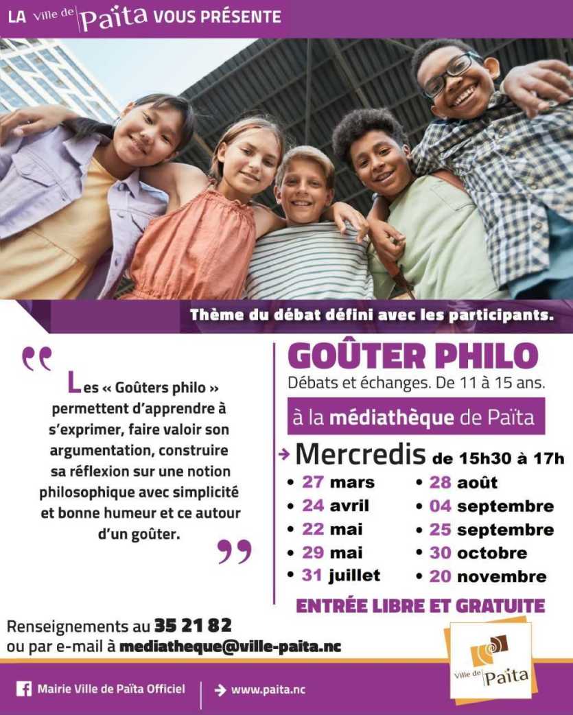 Les goûter philo de la médiathèque de Païta, c’est un mercredi par mois. Photo Ville de PaïtaLa médiathèque propose des goûters philo pour penser le monde. Pour les enfants de 11 à 15 ans, afin d’apprendre à s’exprimer. Gratuit. Ce mercredi de 15h30 à 17 heures. Renseignements sur la page Facebook de la mairie, ou au 35 21 82 – mail : mediatheque@ville-paita.nc.