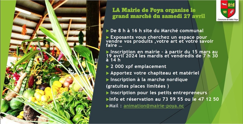 Le grand marché des associations de Poya se tient samedi sur la place du marché. Photo Ville de PoyaSur le site du marché de Poya, un grand marché exceptionnel afin de promouvoir les associations de la commune est organisé ce samedi. De 8 heures à 16 heures, les associations culturelles, artisanales et sportives tiendront des stands de vente, d’informations, et d’animations. Renseignements au 73 59 55 ou au 47 12 50, ou par mail : animation@mairie-poya.nc, ou sur la page Facebook de l’événement.