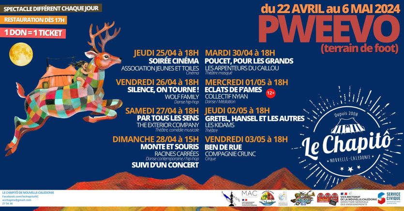 Le programme du Chapitô à Pouébo cette semaine. Photo Le ChapitôDepuis le 22 avril et jusqu’au 6 mai, le Chapitô de Nouvelle-Calédonie s’est installé sur le terrain de foot de Pouébo. Un spectacle différent est proposé chaque jour. L’entrée se fait sous forme de dons, en nature ou en numéraire. A partir de 17 heures, restauration sur site. Ce vendredi soir, à 18 heures, c’est danse hip-hop avec le spectacle Silence, on tourne ! de la Wolf family.