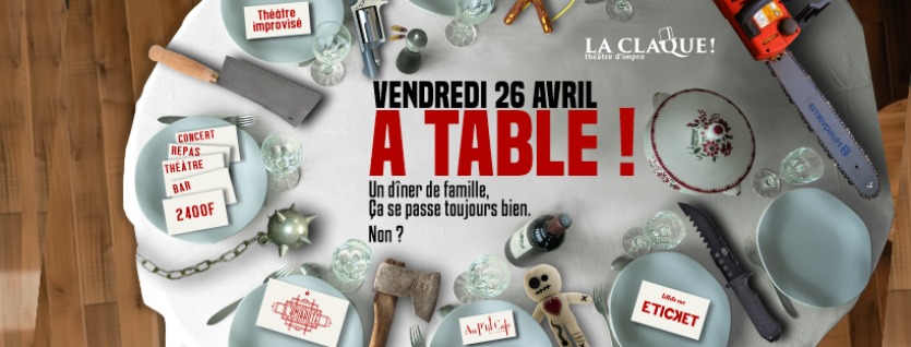 À Table, c’est un dîner, un concert, et un spectacle d’improvisation à l’Amirauté. Photo La Claque improvisationLe spectacle d’improvisation À table ! de la compagnie La Claque ! se tient ce vendredi soir à l’Amirauté, autour d’un dîner concocté par les professionnels du P’Tit café. C’est un dîner de famille comme les autres. Avec ses convives pittoresques, son ambiance chaleureuse, la joie de se retrouver… Le public choisit qui se réunit ce soir et crée les personnages et leurs particularités. Ensuite, les comédiens improvisateurs inventent leur histoire. De 18 heures à 19 heures, dîner au son du concert de Sweet Jam, un duo passionné au répertoire varié de reprises acoustiques et de morceaux de ragga, soul, pop rock et autre reggae. De 19 heures à 20h30 : spectacle, de 20h30 à 22 heures : soirée en douceur sur le deck et dans le jardin. Tarifs : de 1 600 F à 3 900 F, infos et réservations sur eticket.nc, ou sur la page Facebook de l’événement.