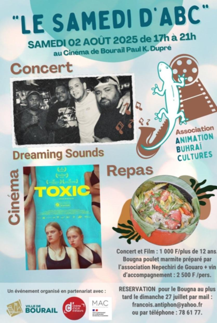 L’Association Animation Buhraï culture propose son rendez-vous mensuel les Samedis d’ABC avec le concert de Dreaming Sounds, la projection du film Toxic et un bougna marmite préparé l’association Nepechiri de Gouaro. Rendez-vous à 17 heures au cinéma Paul K. Dupré.