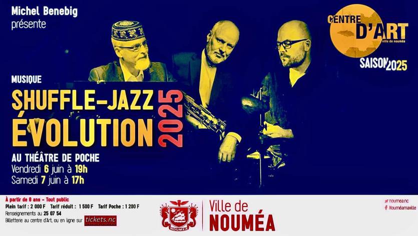 Michel Bénébig sur son orgue Hammond, Lachlan Davidson au saxo, flûte et trompette et Gideon Marcus à la batterie proposent un concert unique de jazz au théâtre de Poche au Centre d’Art de Nouméa ce soir à 17 heures. Des morceaux spécialement composés pour cette soirée, en avant-première d’une tournée en Australie. Tarifs : de 1 200 F à 2 000 F. Billetterie au centre d’Art du mercredi au vendredi de midi à 16h30 et en ligne sur tickets.nc. Renseignements au 25 07 54.