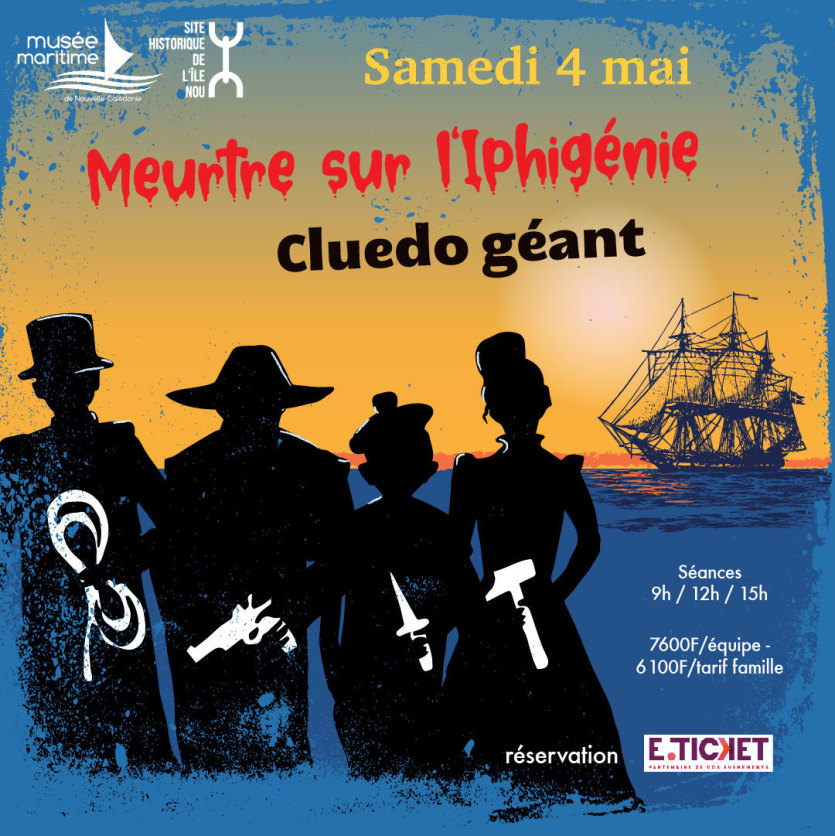 Le Musée maritime et le site Historique de l’île Nou proposent un jeu pour célébrer le 160e anniversaire de l’arrivée du premier convoi de condamnés au bagne en Nouvelle-Calédonie. Photo Musée maritime/Site Historique de l'île NouMeurtre sur l’Iphigénie ! Qui résoudra ce crime qui s’est déroulé sur le premier bateau transportant des condamnés pour le bagne de l’île Nou ? Un événement afin de célébrer le 160e anniversaire du premier convoi de condamnés en Nouvelle-Calédonie. Un jeu sur Smarpthone avec application à télécharger qui conduira les enquêteurs au musée maritime et au site historique de l’île Nou. Par équipe de 6 personnes (max), pour une durée de 2 heures (1 heure par lieu). Une session spéciale famille à 9 heures (tarif : 6 100 F/équipe), puis une session à midi et une autre à 15 heures (tarif : 7 600 F/équipe). Inscription et règlement sur eticket.nc.