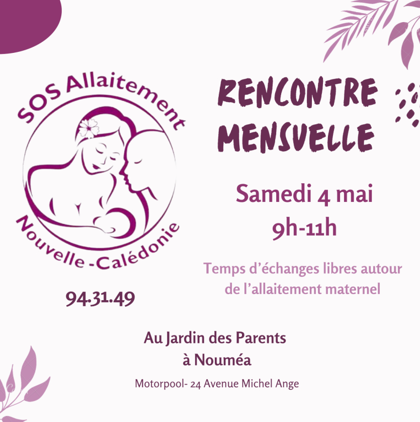 Réunion mensuelle de l’association SOS Allaitement NC, samedi, au Jardin des parents. Photo SOS Allaitement NCL’association SOS Allaitement tient une réunion pour informer sur l’allaitement maternel au Jardin des Parents, à Motor Pool, ce samedi de 9 heures à 11 heures. Inscription obligatoire au 94 31 49, possibilité d’adhérer à l’association, ou de participer sous forme de don. Rendez-vous au 24, avenue Michel-Ange au Motor Pool. Renseignements au 94 31 49 ou par mail :
