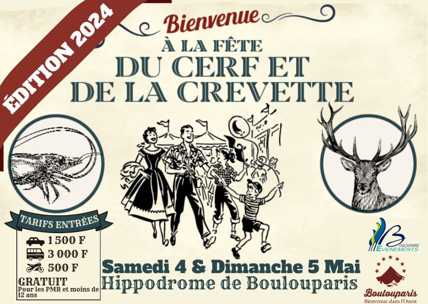 Fête du cerf et de la crevette à Boulouparis samedi et dimanche. Photo Boulouparis événements.L’hippodrome de Boulouparis accueille ce samedi la Fête du cerf et de la crevette, de 8 heures à 18 heures. De très nombreux stands et animations tout au long de la journée. Tarifs : 1 500 F par voiture de 5 passagers max, 3 000 F pour les véhicules de plus de 5 places. 500 F pour les piétons et deux-roues, gratuit pour les personnes en situation de handicap. Plus d’informations au 85 23 33, ou sur la page Facebook de l’événement.