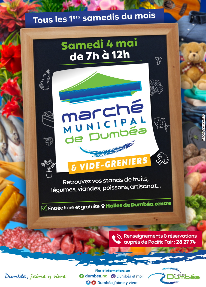Le marché municipal mensuel se tient ce samedi 4 mai aux halles de Koutio. Photo Ville de DumbéaLe parking couvert de Dumbéa centre se transforme ce samedi matin en marché municipal. Rendez-vous de 7 heures à midi aux halles pour un vide-greniers, des fruits et légumes frais, des artisans locaux et des stands variés. Renseignements et réservation de stand auprès de Pacific Fair au 28 27 74 ou sur le site Internet de la mairie.