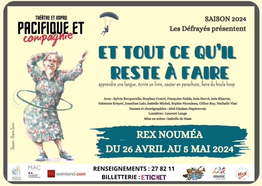 La compagnie Les Défrayés jouent leur spectacle Et tout ce qu’il reste à faire, mis en scène par Isabelle De Haas, sur la scène du Rex du 26 avril au 5 mai. Vieillir est inéluctable, mais comment bien vieillir ? Les 2, 3, 4 et 5 mai à 19 heures. Tarifs : 1 800 F à 2 500 F. Renseignements et réservations sur eticket.nc.