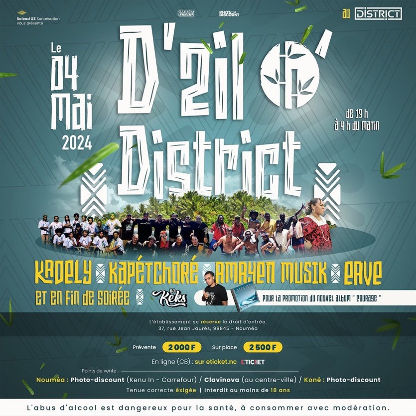 Soirée-concert kanéka au District ce samedi 4 mai. Photo District/Solead GZ sonorisationSolead GZ sonorisation organise la soirée D’zil O', au District ce samedi soir avec quatre groupes de kaneka : Kadély, Kapetchoré, Amayen musik et Ea ve. Le DJ Keks animera la fin de soirée. Tarif : 2 100 F en prévente, 2 500 F sur place. Réservations et infos sur eticket.nc. Plus d’infos sur la page Facebook de l’événement.