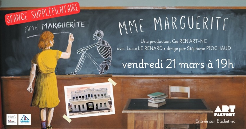 Tour à tour tyran, victime, illuminée, tendre ou flippante… Madame Marguerite a une vision bien à elle de l’enseignement. Et cette fois, les élèves, c’est le public. Ce monologue puissant et grinçant, écrit par Roberto Athayde en 1974 pour contourner la censure, nous plonge dans une école où l’apprentissage ne se limite pas aux manuels… Oubliez tout ce que vous avez appris, Madame Marguerite est là pour vous inculquer la vie, toute la vie. Avec Lucie Le Renard, mise en scène de Stéphane Piochaud. Rendez-vous en salle damier à 19 heures. Tarif : 2 200 F. Réservation sur Eticket.nc. Déconseillé aux moins de 14 ans. Plus d’infos sur la page Facebook de l’événement. 5, rue Jean-Jaurès, Centre-Ville.