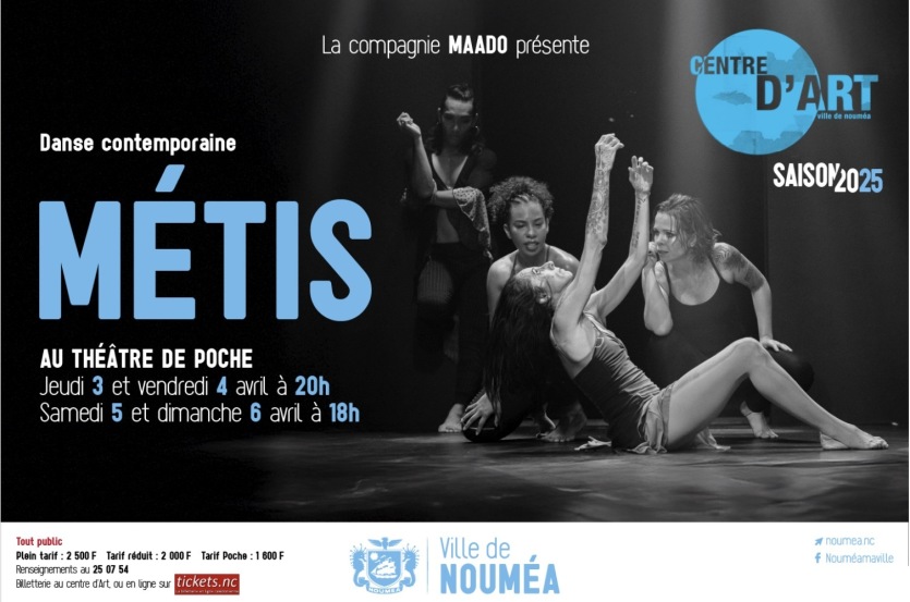 - Métis, spectacle de danse par la compagnie Maado au Théâtre de Poche du Centre d’Art de Nouméa le jeudi 3 et vendredi 4 avril à 20 heures, le samedi 5 et dimanche 6 avril à 18 heures. Tarifs : de 1 600 à 2 500 F. Réservations sur tickets.nc. Renseignements au 25 07 54.