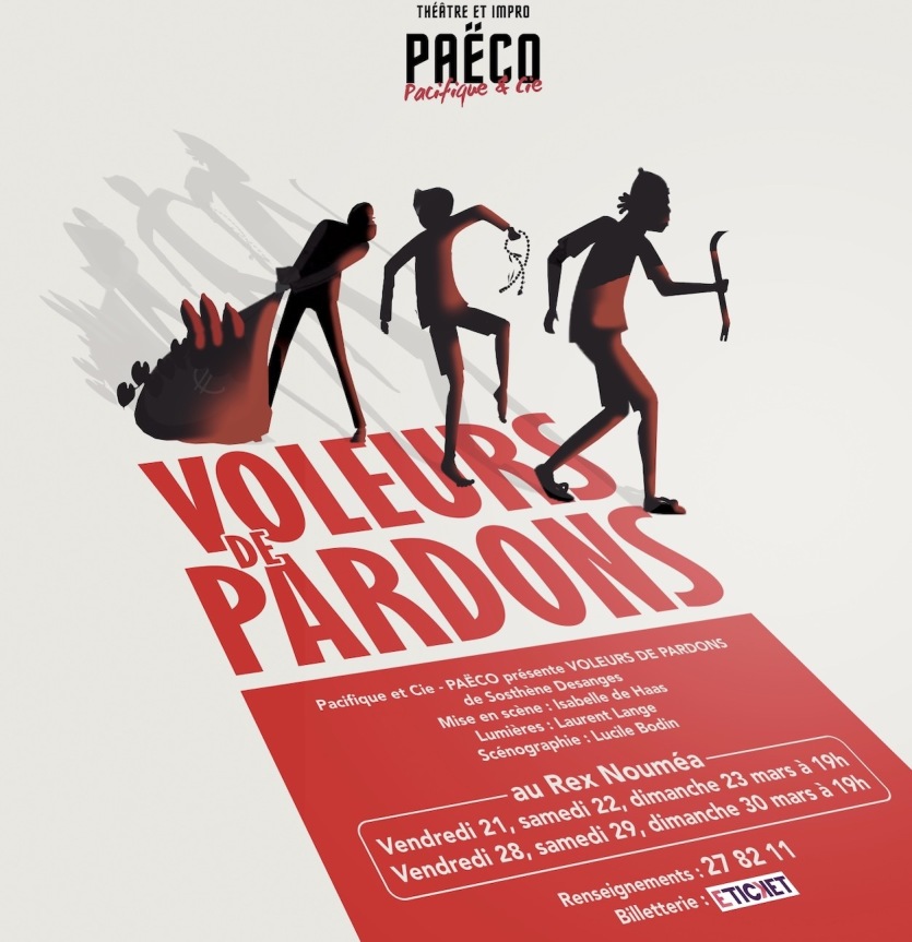 - Voleurs de pardons, une pièce dansée et musicale de Pacifique et Compagnie est jouée sur la scène du Rex vendredi 28, samedi 29 et dimanche 30 mars à 18 heures. Tarifs : de 1 800 F à 2 500 F. Réservations sur eticket.nc.