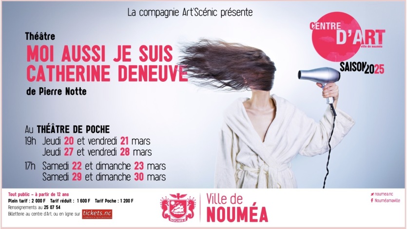 - Moi aussi je suis Catherine Deneuve au Théâtre de Poche, une pièce de la Compagnie Art’Scénic à voir le jeudi 27 et le vendredi 28 mars à 19 heures et le samedi 29 et le dimanche 30 mars à 17 heures. tarifs de 1 200 F à 2 000 F. Réservations sur tickets.nc.
