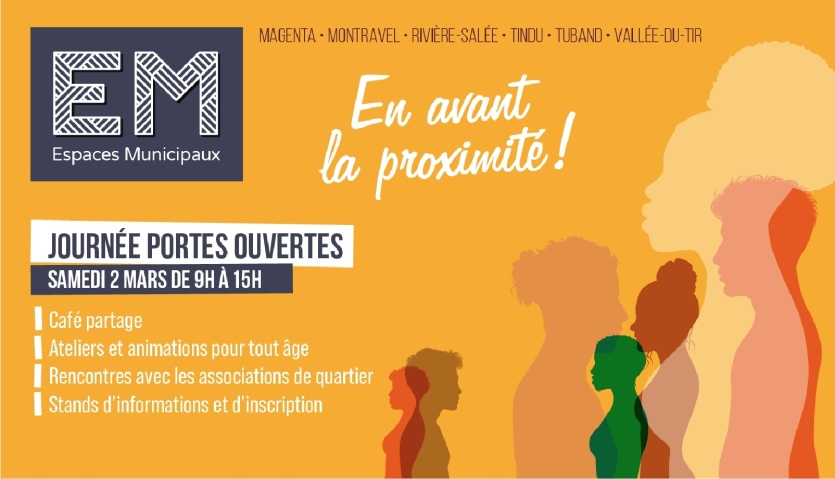 Journée portes ouvertes dans les six espaces municipaux de Nouméa. Photo Ville de NouméaLes six Espaces municipaux (EM) de Nouméa proposent une journée portes ouvertes afin de découvrir les très nombreux rendez-vous organisés chaque jour, chaque semaine, et ce, toute l’année. Ateliers, animations, activités hors les murs, mercredis après-midi, tous les jours sauf le dimanche, les agents municipaux accueillent le public pour des rendez-vous riches, et toujours gratuits. Venez les rencontrer de 9 heures à 15 heures. Espace municipal de Tuband : 10, rue Pascal-Sihaze, tél. : 28 52 82 – espace municipal de Rivière-Salée : 104, avenue Koening, tél. : 44 57 28 – Espace municipal de Magenta : 28, rue André-Rolly, tél. : 28 97 61 – Espace municipal de la Vallée-du-Tir : place Constantine, rue Édouard-Unger, tél. : 28 97 51 – Espace municipal de Tindu : 43, bis rue Edmond-Paulin, tél. : 28 97 49 – Espace municipal de Montravel : 5, rue Georges-Collard, tél. : 28 32 54.
