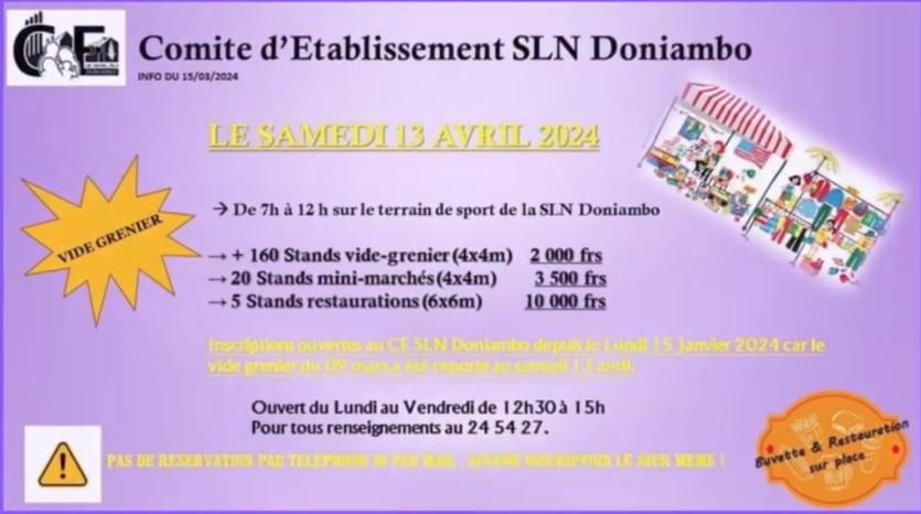Le vide-greniers du comité d’établissement de la SLN, c’est samedi. Photo CE SLN DoniamboLe terrain de sport de la SLN Doniambo accueille ce samedi un vide-greniers et un marché à l’initiative du Comité d’entreprise de la société. De 7 heures à midi, retrouvez 190 stands de vide-greniers, de marché de fruits et légumes et de restauration. Renseignements au 24 54 27.