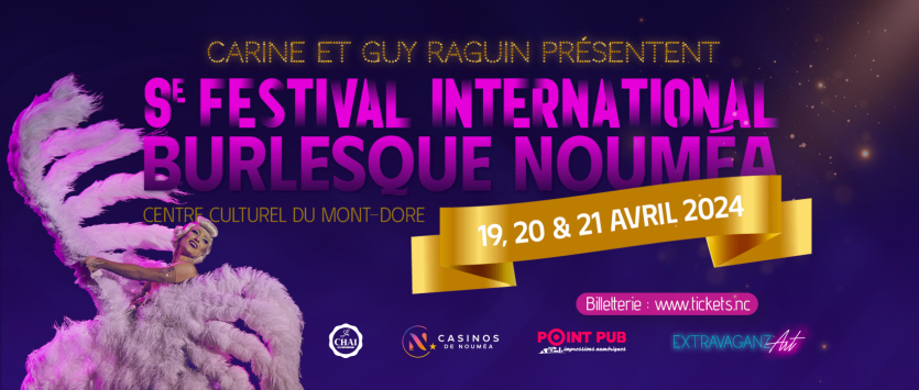 8e festival international de burlesque au Centre culturel du Mont-Dore. Photo ExtravaganzArt.Carine et Guy Raguin organisent le 8e festival international de burlesque au Centre culturel du Mont-Dore les 19 et 20 avril à 20 heures et le 21 avril à 18 heures. Tarifs : de 4 100 F à 5 600 F. Renseignements et réservations sur tickets.nc. Teaser vidéo sur la page Facebook de ExtravaganzArt Nouméa.