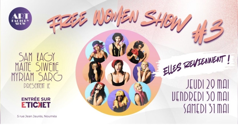 Maïté Siwene, Sam Kagy et Myriam Sarg reviennent enflammer les planches avec leur troisième opus du Free Women Show, une série de sketches pour rire des femmes avec douce moquerie. Chacun devrait reconnaître une amie, une fille, une maman, pour son plus grand plaisir. Rendez-vous dans la salle damier de l’Art Factory à 19h30. Tarifs : 2 700 F. Réservation sur eticket.nc. Plus d’infos sur la page Facebook de l’événement.