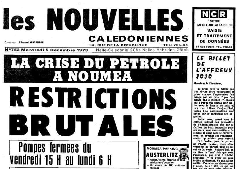 Cette année 1973 a aussi été marquée par le premier choc pétrolier. En peu de temps, le baril de pétrole passe de 3 dollars à près de 12 dollars. Des changements qui n'ont pas épargné la Calédonie qui a dû prendre des mesures drastiques pour réduire sa consommation d'essence. À l'époque, le conseil de gouvernement, présidé par Michel Levallois, prend un arrêté qui interdit notamment la vente d'essence en jerrican, la vente d'essence du vendredi à 15 heures au lundi à 6 heures sur l'ensemble du territoire, ainsi que celle d'hydrocarbures liquides aux bateaux de plaisance et aux aéronefs pour des vols d'agrément. Des mesures qui ont eu pour conséquence directe une ruée des Calédoniens vers les stations-service afin de faire du stock. « Leurs clients sont revenus deux ou trois fois faire le plein », peut-on lire dans les Nouvelles.