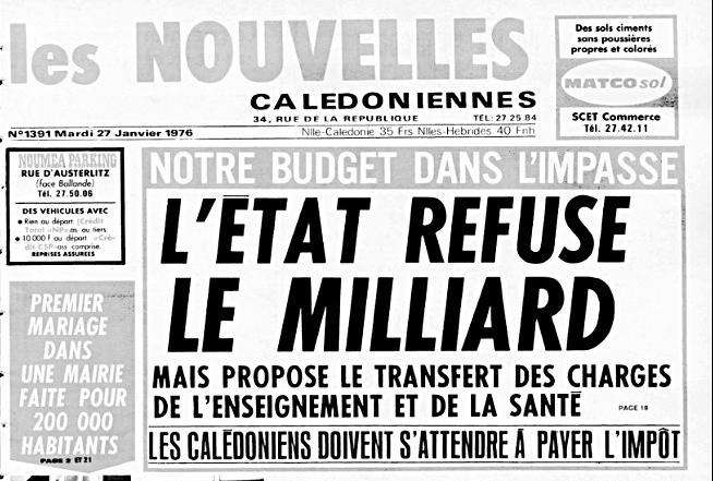 L'année commence sur les chapeaux de roues, le 3 janvier, avec deux évasions du Camp-Est, des détenus qui manifestent et une intervention des gardes mobiles. Le 27 janvier, la trêve des confiseurs est bel et bien finie : « Notre budget dans l'impasse, l'État refuse le milliard mais propose le transfert des charges de l'enseignement et de la santé, les Calédoniens doivent s'attendre à payer l'impôt. » Le même jour, un jeune couple fait la une : leur mariage est le premier à être célébré dans le nouvel hôtel de ville de Nouméa. Cette mairie, pensée pour une commune de 200 000 habitants, accueillera 120 employés.