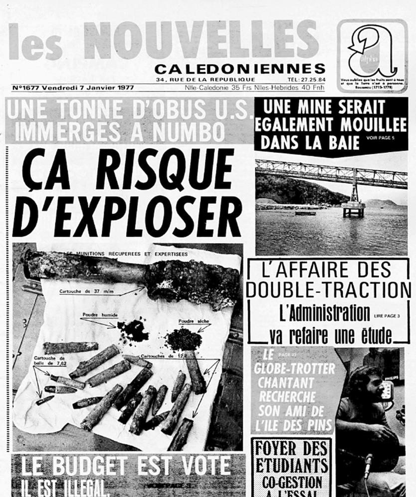 L'année 1977 commence par un constat pour le moins explosif. Depuis leur découverte deux ans auparavant, une tonne de munitions de calibres divers gît toujours éparpillée par 5 mètres de fond en baie de Numbo, non loin des quais de la cimenterie. Un « cadeau » laissé par les Américains lors de leur départ du Caillou.