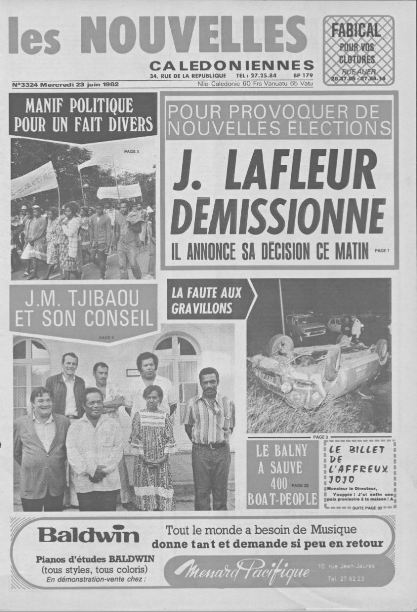 Le mois de juin 1982 constitue un chapitre clé de l'histoire politique du pays. Le 12, la FNSC, de plus en plus opposée au RPCR notamment sur les réformes foncières et fiscales, décide à Bourail de s'allier au Front indépendantiste. Trois jours plus tard, la motion de censure déposée à l'encontre du Conseil de gouvernement de Dick Ukeiwé est votée. Le 22, Jean-Marie Tjibaou est élu vice-président du Conseil de gouvernement. Le lendemain, en réaction, Jacques Lafleur annonce son souhait de démissionner de l'Assemblée nationale. Le but : provoquer de nouvelles élections.