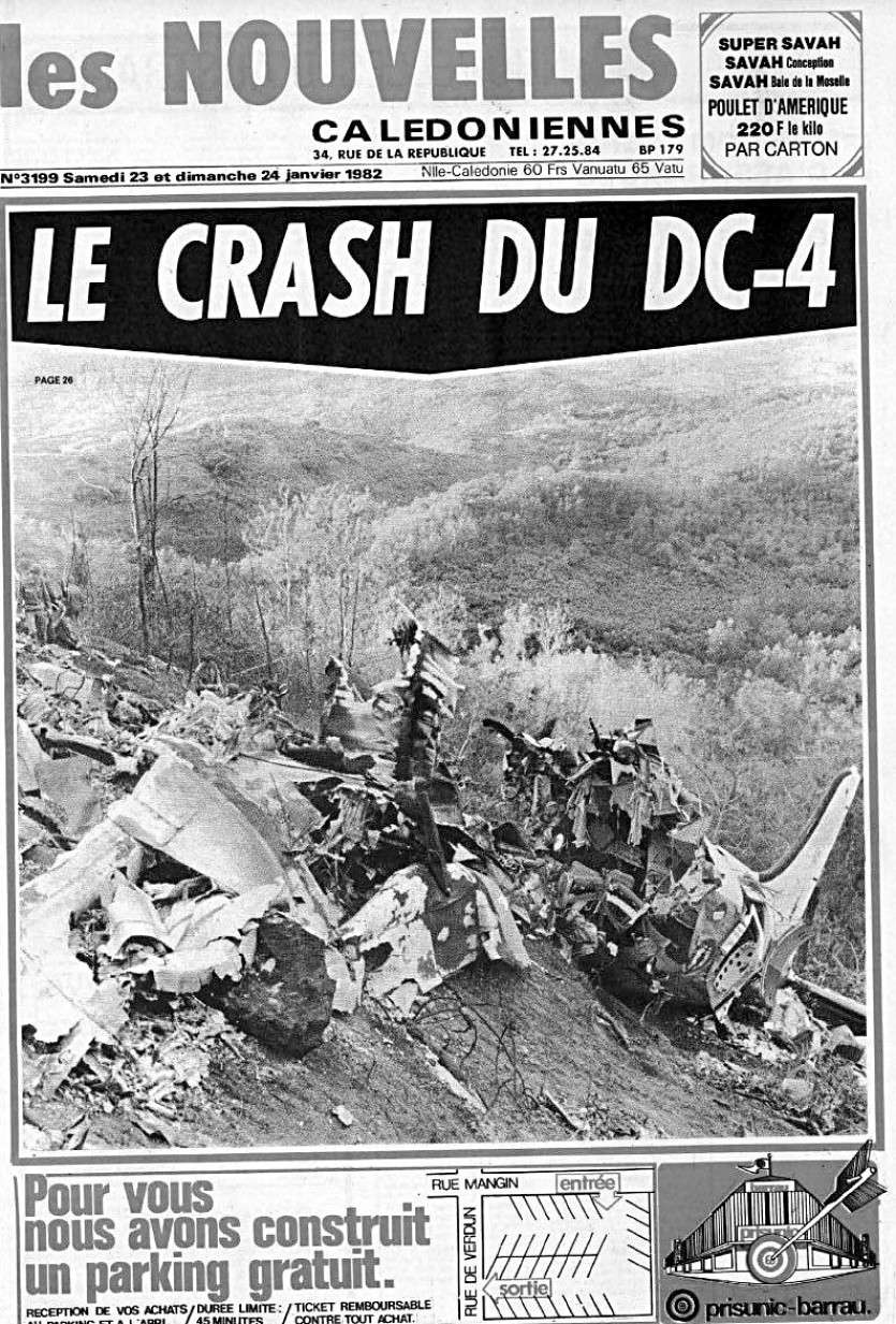 L'année 1982 a balancé entre des faits divers dramatiques et une actualité politique particulièrement dense voire animée. La page sombre s'ouvre le 21 janvier. Un avion DC-4, numéro 9148, s'écrase contre le mont Kokoréta, au-dessus de la tribu de Bangou, à Païta. Bilan de la catastrophe : sept militaires décédés dans le crash. L'appareil avait été offert par Harry Truman, président des États-Unis, à Charles de Gaulle, chef de la France libre, en 1945.
