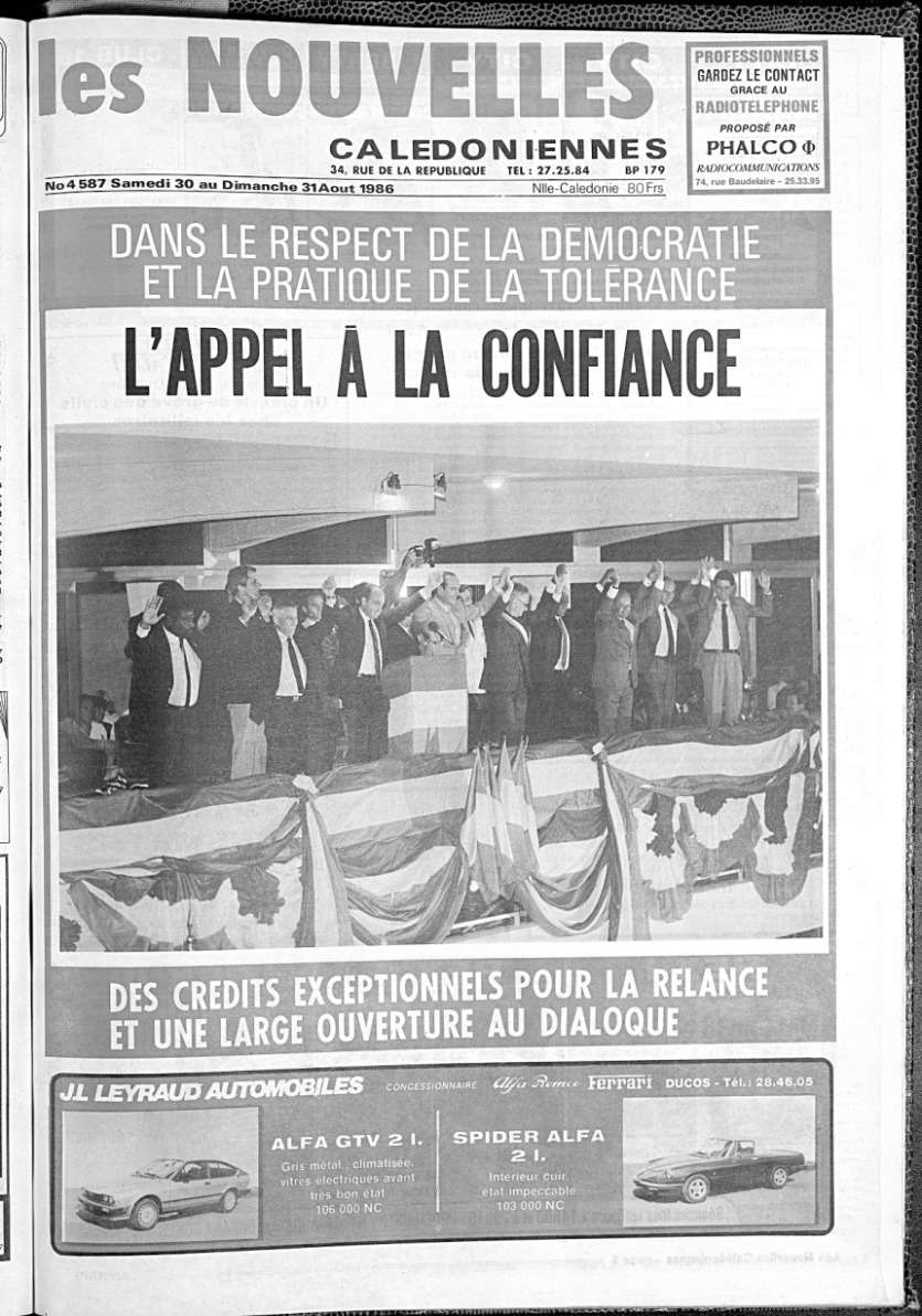 Après une année où les violences ont presque chaque jour fait la Une, la vie semble reprendre un peu son cours. Dans la capitale, deux projets de centres commerciaux sont lancés (le Palm Beach et Port Plaisance), le kiosque à musique, termité, est reconstruit à l’identique, le Bingo ouvre, le Kuendu Beach se construit. À Bourail, le collège s’agrandit et le musée est inauguré. L’arrêté du 28 novembre 1984 interdisant la vente et le transport de boissons alcoolisées ou fermentés ailleurs qu’à Nouméa est levé en juillet. En septembre, "pour la première fois depuis les Évènements, des mariages sont célébrés à Lifou". Mais partout, en Brousse surtout, les tensions restent omniprésentes. Les 11 et 12 janvier, week-end de recueillement en mémoire d’Yves Tual et Eloi Machoro, des incidents ont lieu à La Foa. En février, un attentat ravage deux étages de l’immeuble du service des impôts. Les expulsions se poursuivent. Des sabotages sont commis sur des équipements publics comme privés. Le 15 novembre, Jammes Fels, un adolescent, est tué par balle en marge d’une réunion publique du RPCR à Thio, douze personnes sont blessées, "preuve" que les violences n’ont pas cessé. Socialement, l’année est marquée par de nombreuses grèves (internats, poste du Mont-Dore, etc.). Au niveau politique, Jacques Lafleur et Maurice Nénou remportent les législatives de mars, boycottées par le FLNKS. Le gouvernement passe à droite et Bernard Pons, ministre des Outre-mer, s’attèle à élaborer une réforme du statut du territoire que Jacques Chirac vient défendre en août, avec 10 milliards d’aides dans sa mallette. Quatre mois plus tard, en réponse au FLNKS, qui menace de boycotter le référendum de 1987, Bernard Pons propose de limiter le corps électoral aux Calédoniens résidant sur le territoire depuis au moins trois ans.