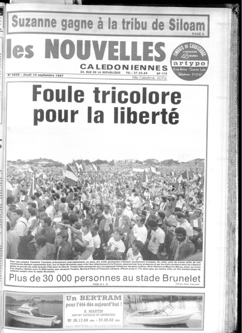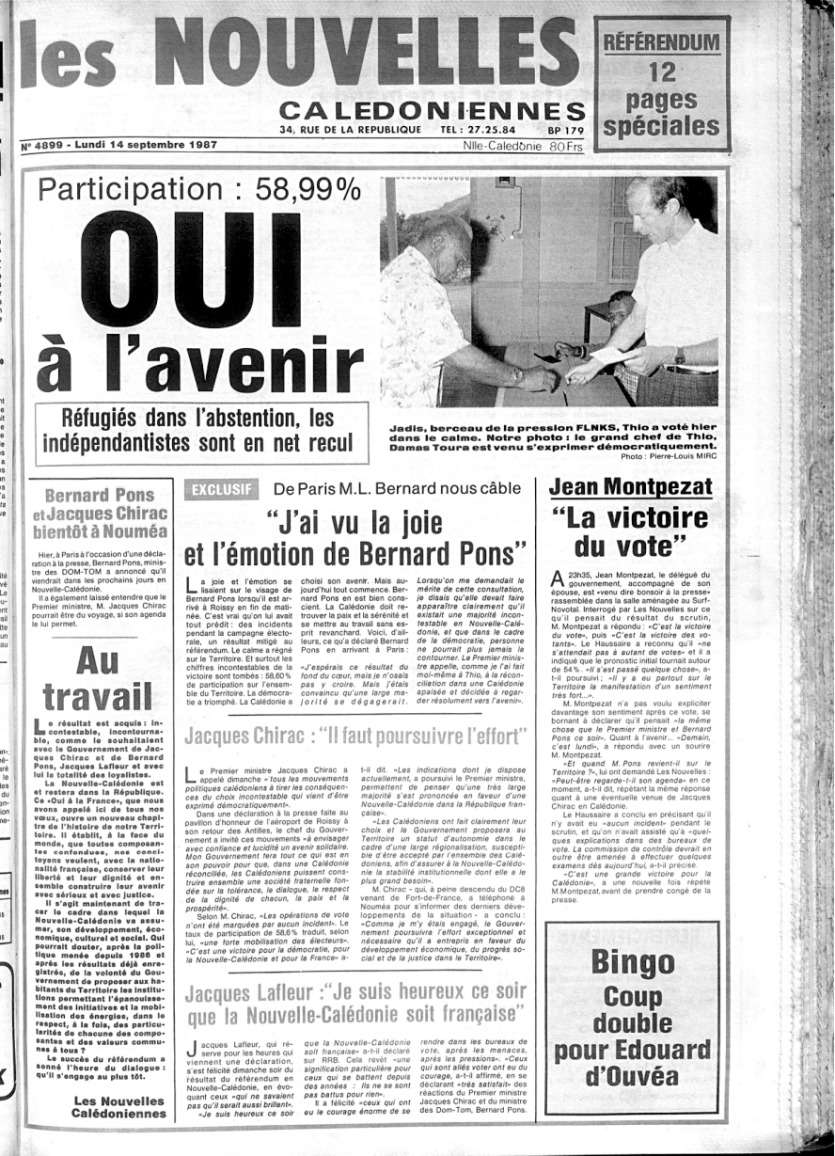 - Joanna Jullien | Crée le 08.07.2021 à 17h23 | Mis à jour le 12.07.2021 à 20h01ImprimerUne des Nouvelles 14 septembre 1987 premier referendum en Nouvelle-Calédonie Photo archivesLNC