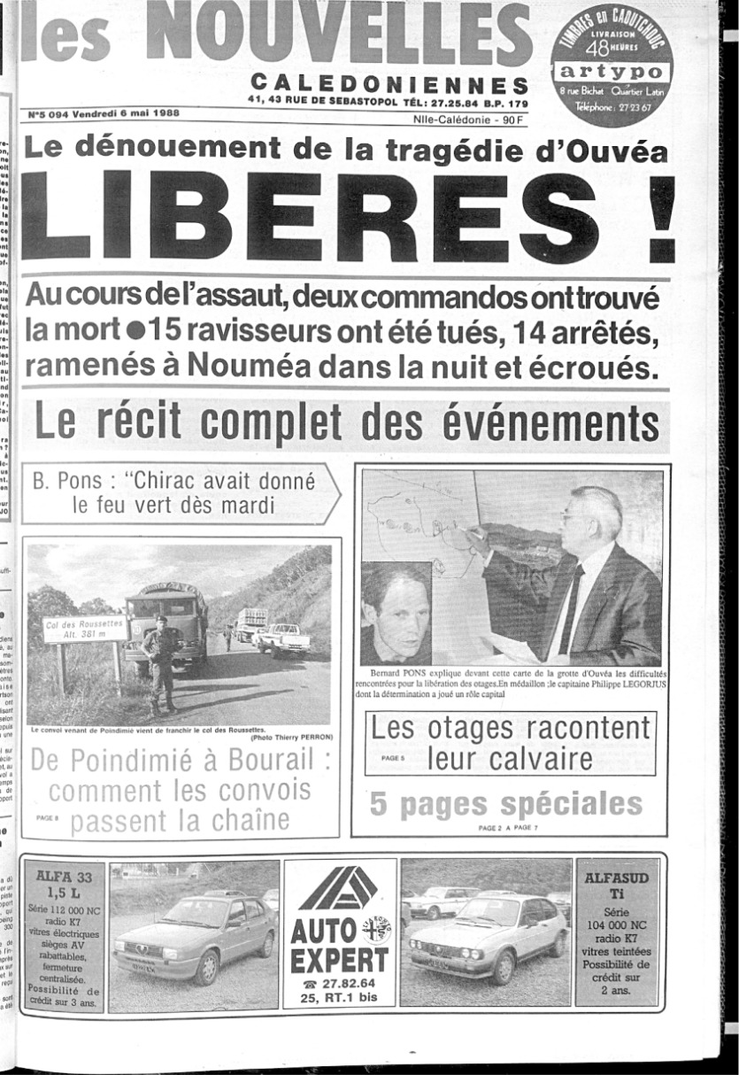 L'année 1988 débute avec la visite, le 12 janvier, du cyclone tropical Anne, "le plus fort qu'ait connu la région depuis 10 ans", titreront les Nouvelles Calédoniennes, dès le lendemain. Il fera la une du journal pendant plus de 5 jours, et tuera 2 personnes. Le 22 avril, 40 membres du FLNKS s'emparent de la gendarmerie de Fayaoué, y volent des armes, tuent 4 gendarmes et en kidnappent 27 autres, qui, pour une part d'entre eux, resteront pris en otage une dizaine de jours dans la grotte de Gossanah, la volonté étant de faire annuler le statut Pons, mis en place en début d'année, et refusant l'accès à l'indépendance. Le 5 mai, l'"Opération Victor" permet le "dénouement de la tragédie d'Ouvéa": la grotte de Gossanah est prise d'assaut par les commandos de l'armée, afin de libérer les otages. Cet acte conduira à la mort de 19 indépendantistes, et 2 militaires. Parallèlement, François Mitterrand est réélu président de la République le 8 mai, face à Jacques Chirac, qui lui, remporte un vrai succès en Calédonie, où il réalise 90 % des voix. Le 26 juin, l'accord de Matignon est signé. Fruit de négociations entre Jean-Marie et Jacques Chirac, il prévoit l'organisation d'un scrutin d'autodétermination local dans 10 ans. Il sera complété, le 19 août, par l'accord d'Oudinot, prévoyant le découpage des provinces. Le 6 novembre, un "oui" "du bout des lèvres" (57,04 %) est voté en faveur de la mise en place de ces accords sur le territoire.