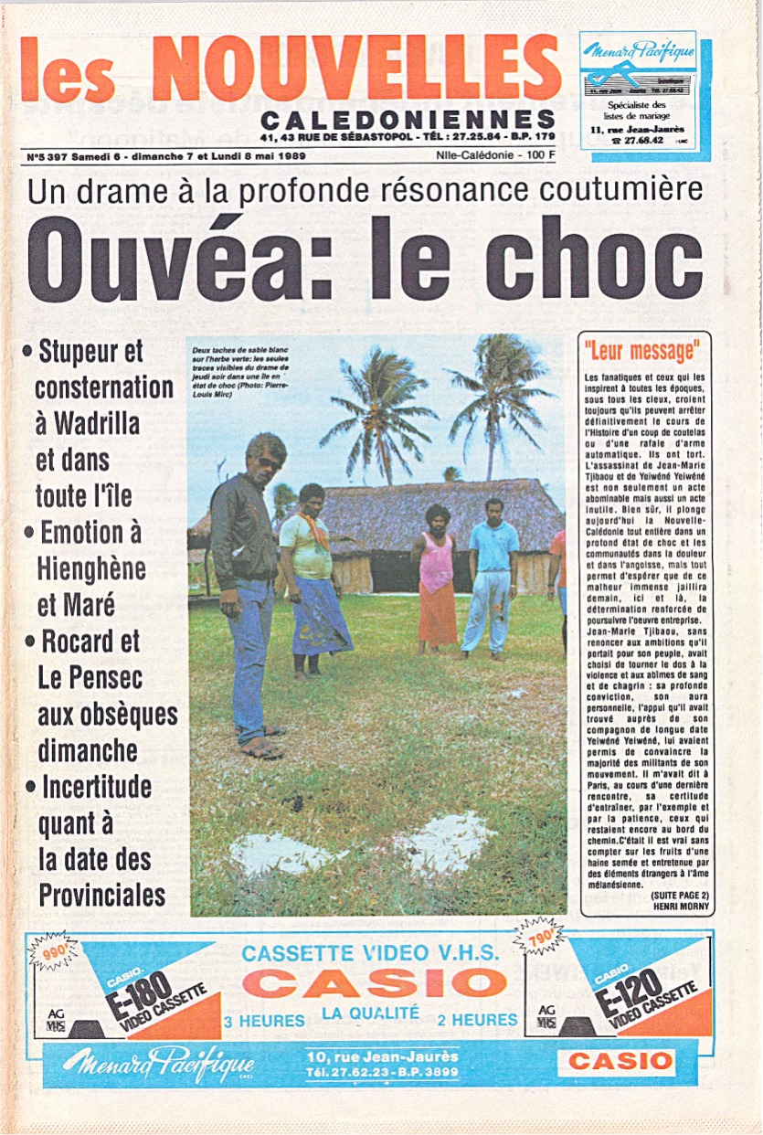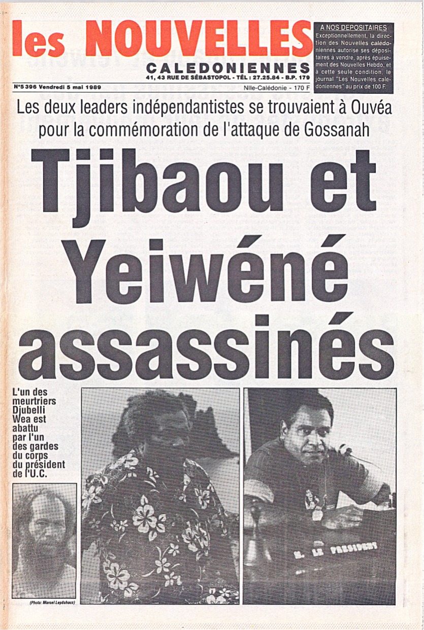 Un drame absolu. Aucune autre information ne peut figurer sur ces Unes là, celles des 5 et 6 mai 1989, lendemains des terribles assassinats de Jean-Marie Tjibaou et de Yeiwene Yeiwene. Djubelly Wea, immédiatement abattu par un garde du corps, n'avait pas digéré la poignée de main ni la signature des Accords de Matignon.
