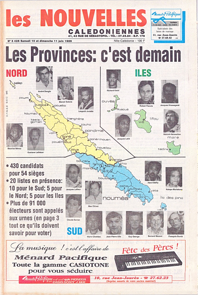 Les premières provinciales voient l'élection de Jacques Lafleur (Sud), Léopold Jorédié (Nord) et Richard Kaloï (Îles).