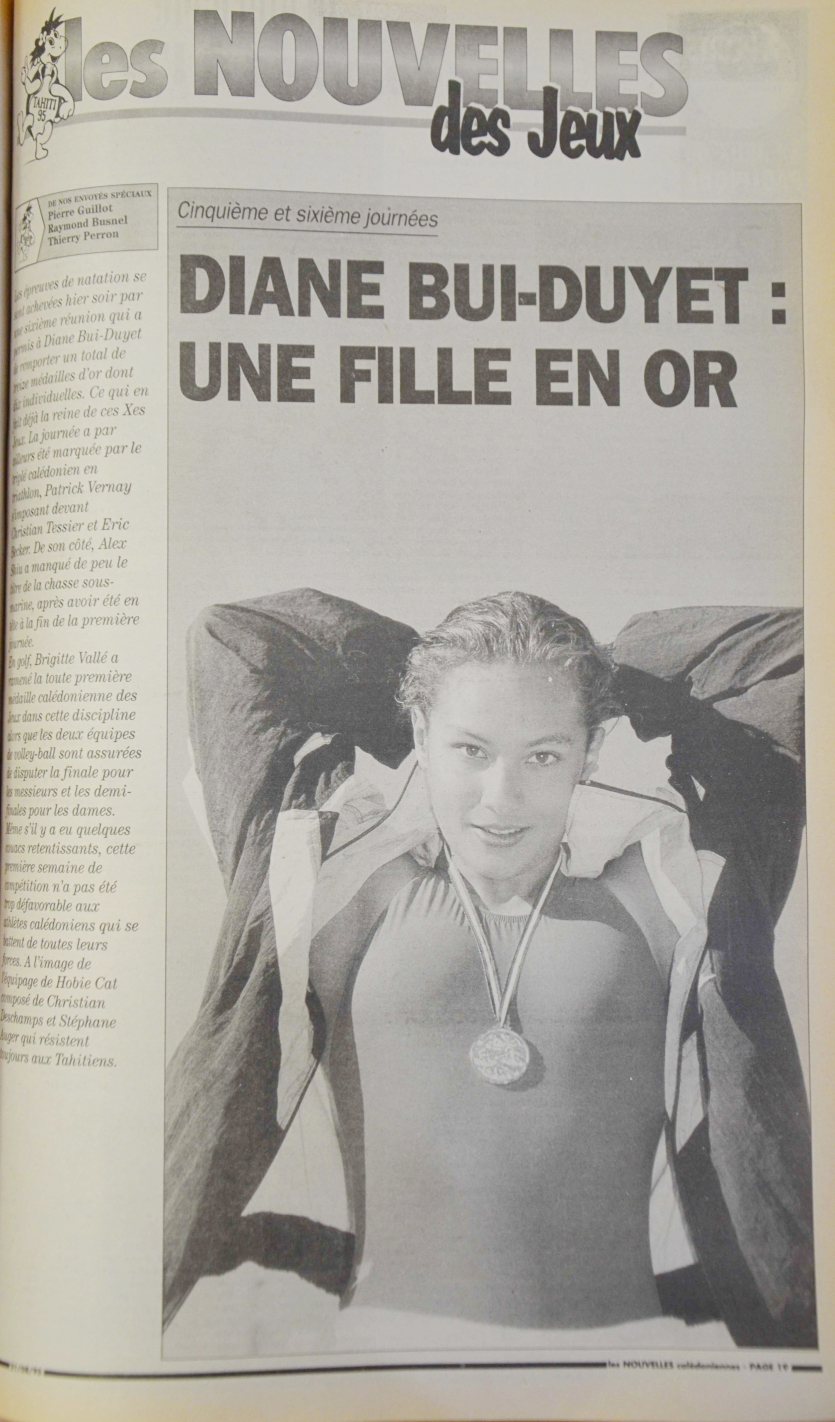 Une certaine Diane Bui-Duyet en reviendra avec 13 médailles d'or autour du cou, dont dix individuelles. La jeune nageuse est sacrée " Reine des Jeux ". Et avec 83 médailles au total, la délégation calédonienne remporte sa huitième victoire en dix participations.