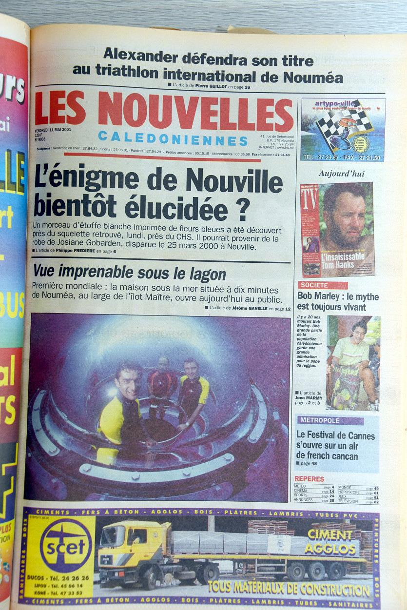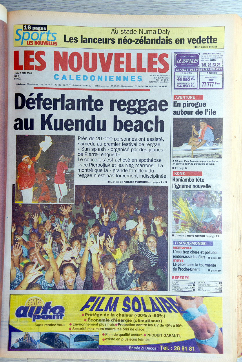 Si depuis le 1er janvier le salaire minimum garanti est passé à 82 000 F, il faut attendre le 1er juillet pour qu'il atteigne la barre des 100 000 F. Une aubaine puisque les tarifs de l'eau, des billets d'avion ou de l'alimentaire vont augmenter tout au long de l'année. L'eau, c'est avant tout l'affaire de Mickaele Holoïa, lui qui, début février, à la plage du centre culturel Tjibaou, termine enfin son tour du Caillou... à la nage, soit un périple de 1 200 km. Une première en Calédonie. Comme la revendication devant le tribunal de deux homosexuels, en février, qui réclament leur droit au concubinage. Ou, comme Ghislaine Creugnet lors des élections municipales de mars, qui devient la première femme maire d'une commune, celle de Farino. Début mai, grande première sur la plaine du Kuendu Beach, un concert géant est organisé durant neuf heures, devant 20 000 personnes. Au programme, pas d'alcool mais que du reggae avec des groupes locaux et des invités de prestige, tels Pierpoljak ou les Neg Marrons. Première toujours mais mondiale cette fois-ci, une « maison sous la mer » est ouverte au public à 10 min de Nouméa. Une activité pas spécialement appréciée de la jeunesse calédonienne, qui elle préfère boire du kava et/ou fumer des joints. Selon les autorités, plus d'une centaine de nakamals sont recensés sur la Grande Terre et les îles, et la gendarmerie dénonce une consommation croissante de cannabis. Face à l'augmentation de la demande, le trafic s'organise et les saisies se multiplient. Les attentats suicides du 11-Septembre ne touchent pas que les Américains. Trois miraculés calédoniens présents ce jour-là livrent leurs témoignages aux Nouvelles, dont Sandrine Ledoux, alors étudiante, qui déclare : « J'ai donné mon sang ! » Deux mois plus tard, les douanes interceptent des tee-shirts à l'effigie de Ben Laden dans des colis en provenance de Thaïlande. Enfin, dernière première de l'année, deux braqueurs à mains armées attaquent une agence de la Société générale, à Ducos. Ils en repartent à moto avec un butin estimé à plus d'un million.