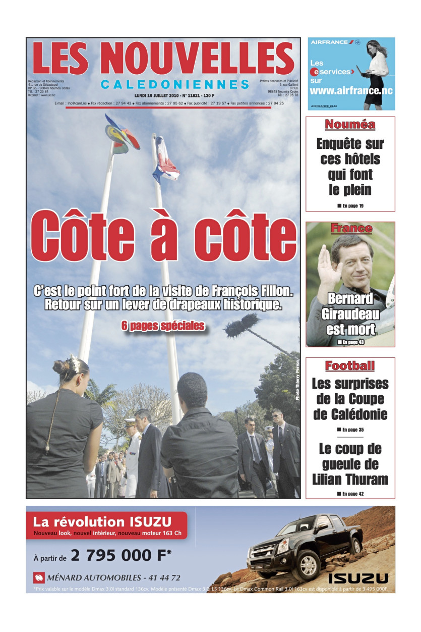 Alors qu'il y siégeait depuis 1972, Jacques Lafleur démissionne du Congrès le 8 avril. Amer, il déclare « Je suis seul et je ne peux rien faire seul. Je crains qu'à force d'égoïsme, on se dirige à nouveau vers des troubles ». Triste nouvelle le 4 mai avec la disparition de l'inclassable artiste Nicolaï Michoutouchkine. À la fin du mois ont aussi lieu les obsèques du très respecté grand chef de la Conception, Joseph Goanetcha Pidjot. Le 15 juillet, les deux drapeaux sont levés au Mwa Ka et au Sénat. Le 18 juillet, ce sera au haut-commissariat en présence du Premier ministre, François Fillon. En sport, le Nouvelle-Calédonie, barré par Bertrand Pacé, remporte le Tour de France à la voile. Le 19 août, gros titre sur l'adoption de trois signes identitaires : la devise, l'hymne et les billets.