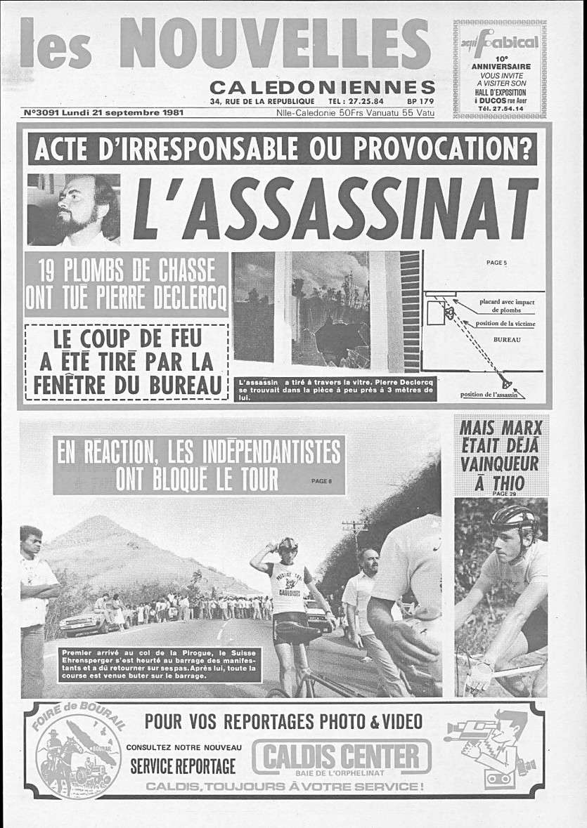 Cinquante-deux pétroglyphes ont été inventoriés, le 22 janvier, à Ponérihouen. Deux archéologues amateurs travaillaient depuis des années sur le site de Bhraghra. Le 26 février, le futur campus universitaire prend la place du cimetière de l'île Nou. Les restes étaient ceux de surveillants pénitentiaires. Ils ont été transportés au 4e Kilomètre. Ce sont les prisonniers du Camp-Est qui ont exhumé les tombes. Les Calédoniens n'ont failli ne jamais voter à la présidentielle de cette année-là. Le 1er avril, on apprend qu'une erreur du Journal officiel empêcherait les habitants du Caillou de participer au scrutin. Les fonctionnaires avaient simplement oublié de convoquer les électeurs du pays... Et ce n'était pas une farce, assure notre édition du 2 avril ! L'erreur sera corrigée rapidement, 7 280 Calédoniennes et Calédoniens se rendront aux urnes. À l'inverse des résultats nationaux, qui consacrent Mitterrand, Giscard arrive en tête avec 48,82 %. À l'hôpital Gaston-Bouret, le 28 juillet, les soignants tiraient déjà la sonnette d'alarme. Ils déploraient des conditions de travail "inacceptables". Les médecins et les infirmiers "craquent", titrait déjà notre journal. Le 21 septembre, le secrétaire général de l'Union calédonienne, Pierre Declercq, a été assassiné. Un tireur l'a abattu dans son jardin à Robinson depuis la fenêtre d'un bureau. Un suspect a très vite été interpellé, mais les coupables n'ont jamais été arrêtés. L'année 1981 se termine sous des trombes d'eau. Le cyclone tropical Gyan touche la Calédonie entre le 22 et 26 décembre. En vingt-quatre heures, la station de Ouenarou, à Yaté, avait enregistré jusqu'à 586 mm de pluie, selon Météo-France NC. Trois personnes avaient perdu la vie, deux par noyade et une électrocutée.