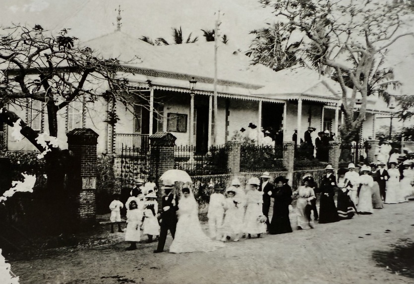 Mariage d'Adrien Tessier et de Marguerite Goyetche : au premier plan, Marguerite au bras de son père Pierre, puis derrière le cortège d'enfants de chœur, le marié et sa mère Angélina Reveillon en noir, et derrière Angélina, Marie Gastaldi épouse Goyetche, la mère de la mariée.Elles sont les premières épouses de transportés venues rejoindre leurs maris, respectivement Charles Aillaud matricule 78 et Jean-Marie Tessier matricule 253. " (Source Louis-José Barbançon.)