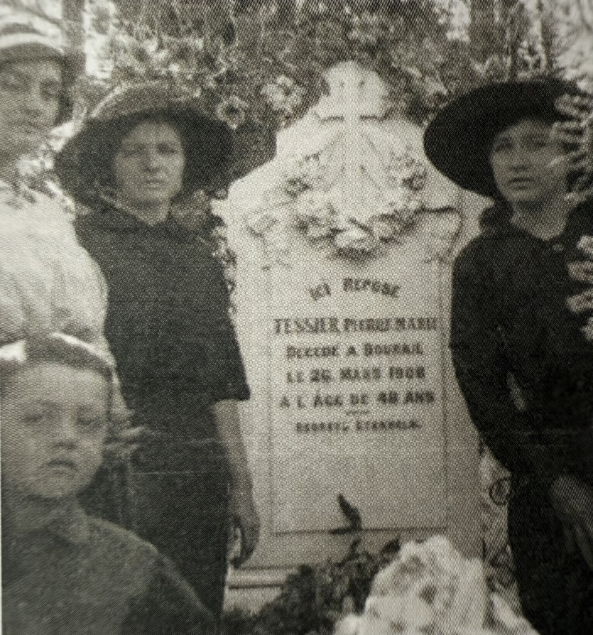 Les filles de Pierre Tessier, fils de Jean-Marie, autour de la tombe de leur père en 1908, l'année de son décès. Crédit photo : coll. Louis Lagarde.Nouvelle vie au paradis